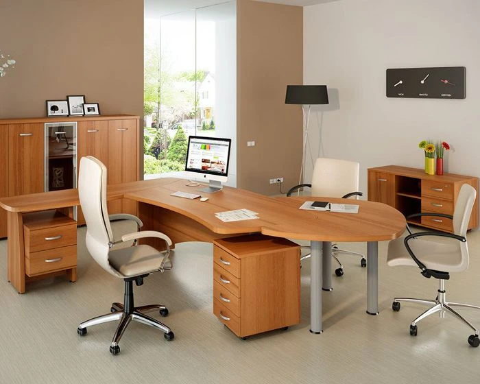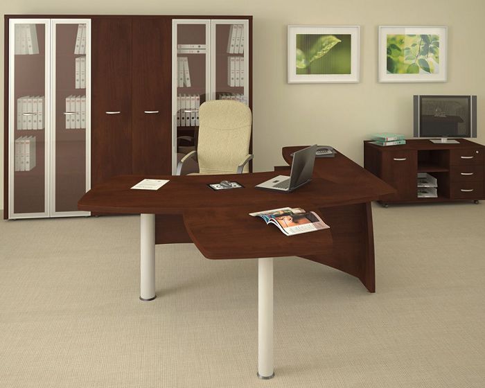 Данная мебель для офиса подойдет для помещений любого размера, ее несложно дополнить другой фурнитурой в случае необходимости – это могут быть даже яркие вещи, не похожие по оттенку на основной стиль. Но лучше всего выглядят дополнительные аксессуары, выполненные в белом, или других светлых цветах. В комплекте присутствую также металлические детали, благодаря которым любая офисная техника будет выглядеть уместно в общем дизайне помещения.